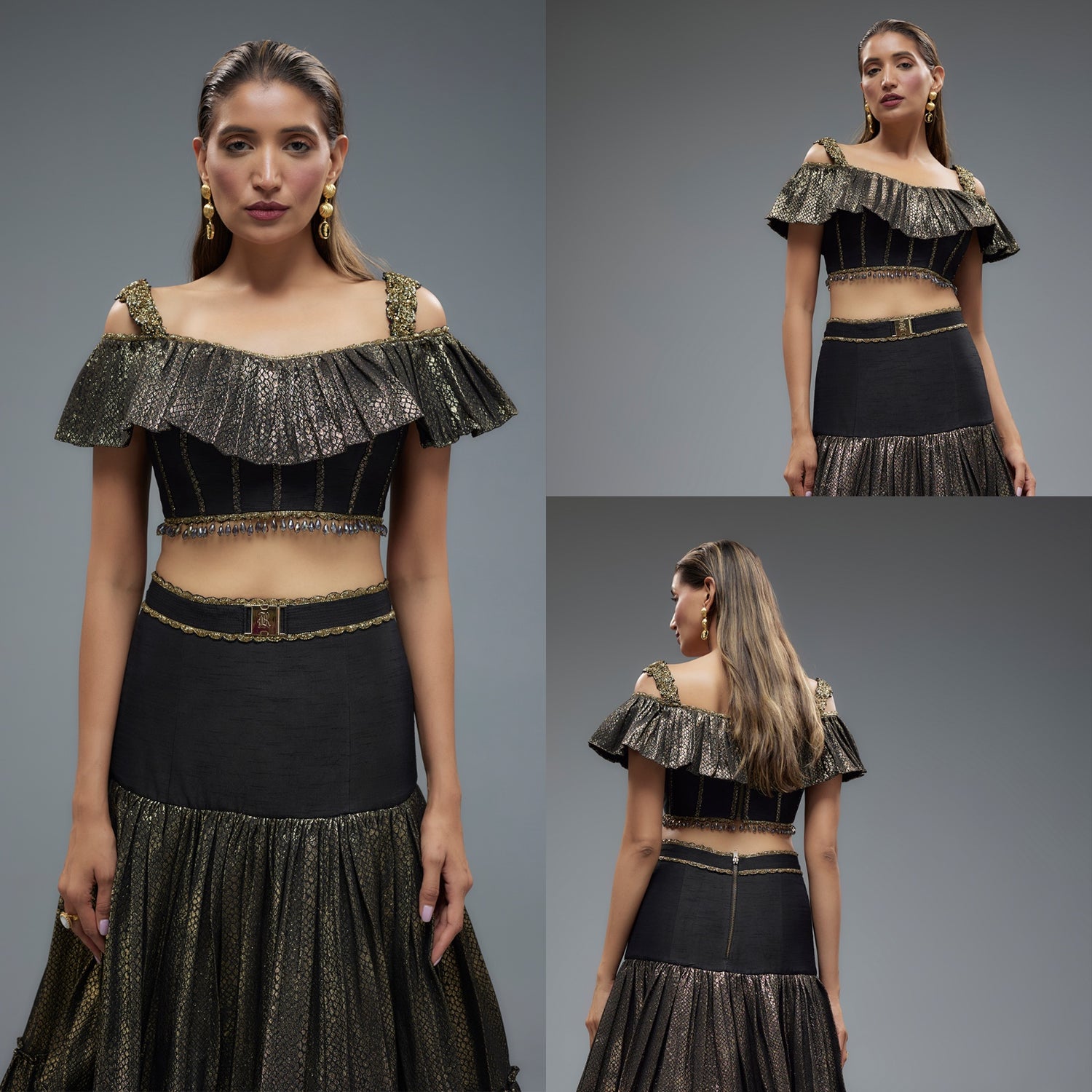 Black Ruffle Blouse And Raw Silk Lehenga Set