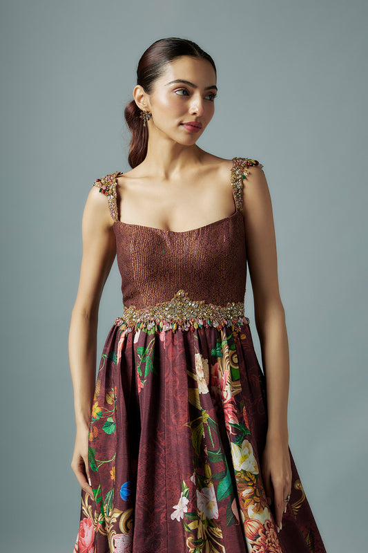 Maroon raw silk and botanical printed gown