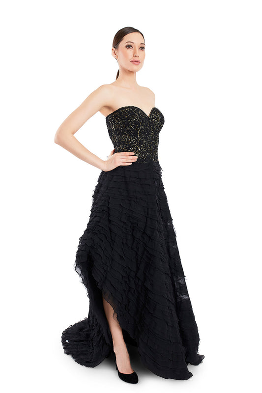 Beige Ruffle Blouse with Heavy Embroidered Sequin Lehenga