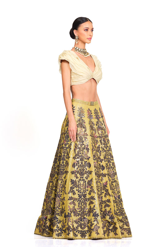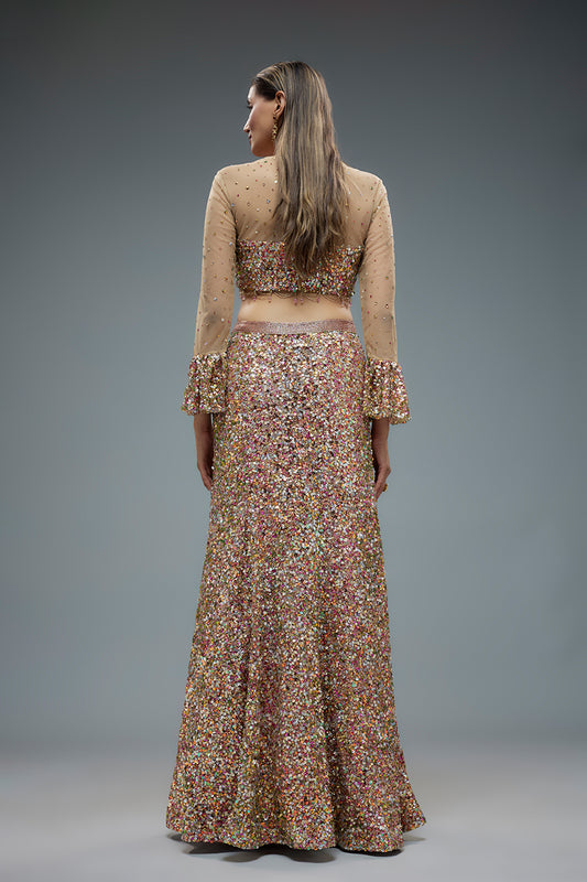 Beige Ruffle Blouse with Heavy Embroidered Sequin Lehenga