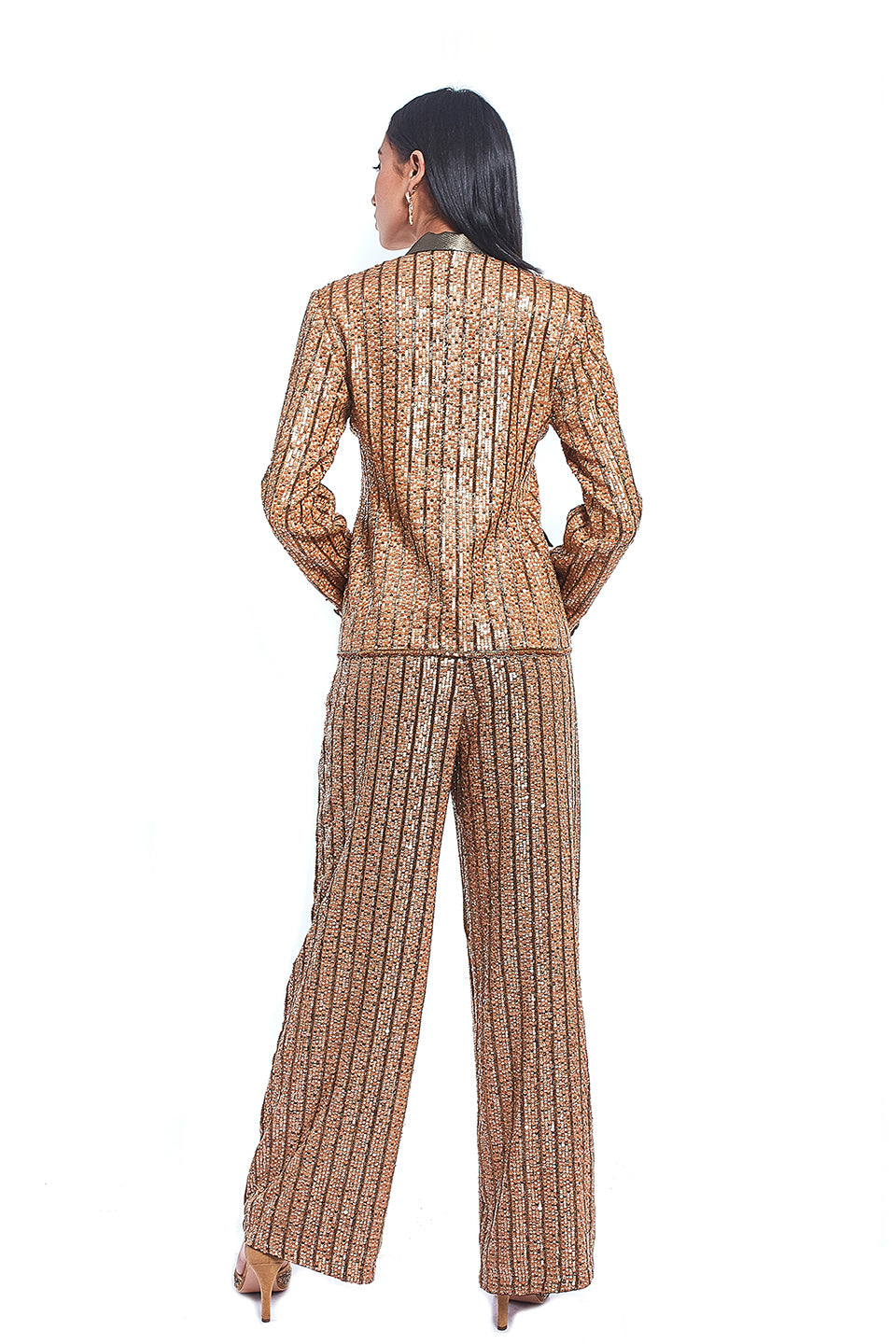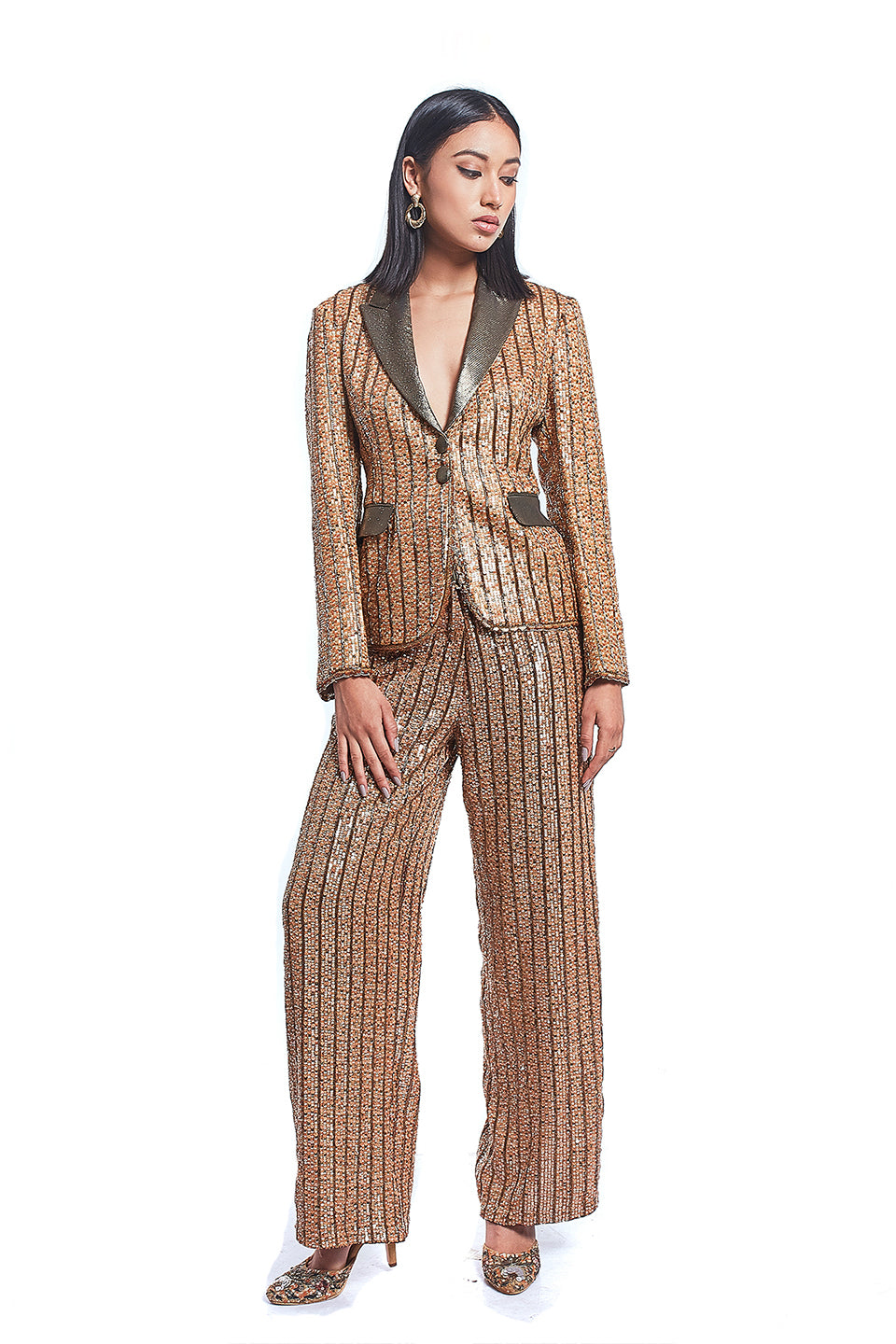 This handcrafted gold blazer is made of sequins and glass pipe material for embroidery. The fabric is satin. The lapel is shimmering fabric. The front button closure is a design element. Complete the look with matching trousers and minimal jewellery.