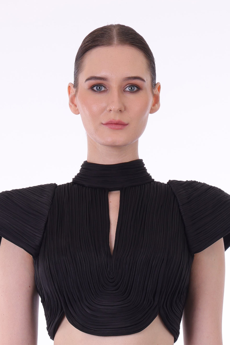 This top has a unique avant-garde look, but it is still very comfortable to wear. It features delicate, handcrafted cordwork allover. The underbust cut adds to its style and elegance. It also has a back zip closure. To complete the outfit, pair it with a skirt, earrings, and rings for an overall look that is both chic and delicate.