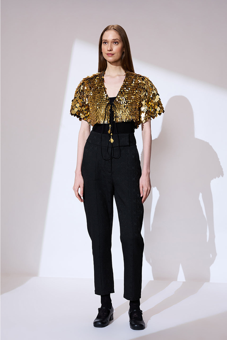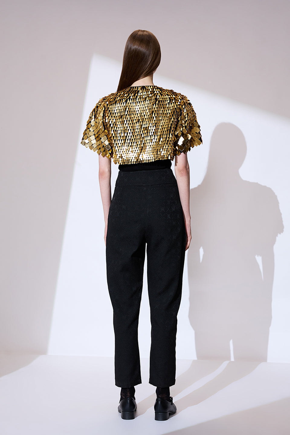 This one-of-a-kind top features intricate floral patterns of crystals across the entire garment. The fabric is dark colored. The top also features a deep U-shaped neckline. To style, pair the top with solid black pants or a solid black skirt.