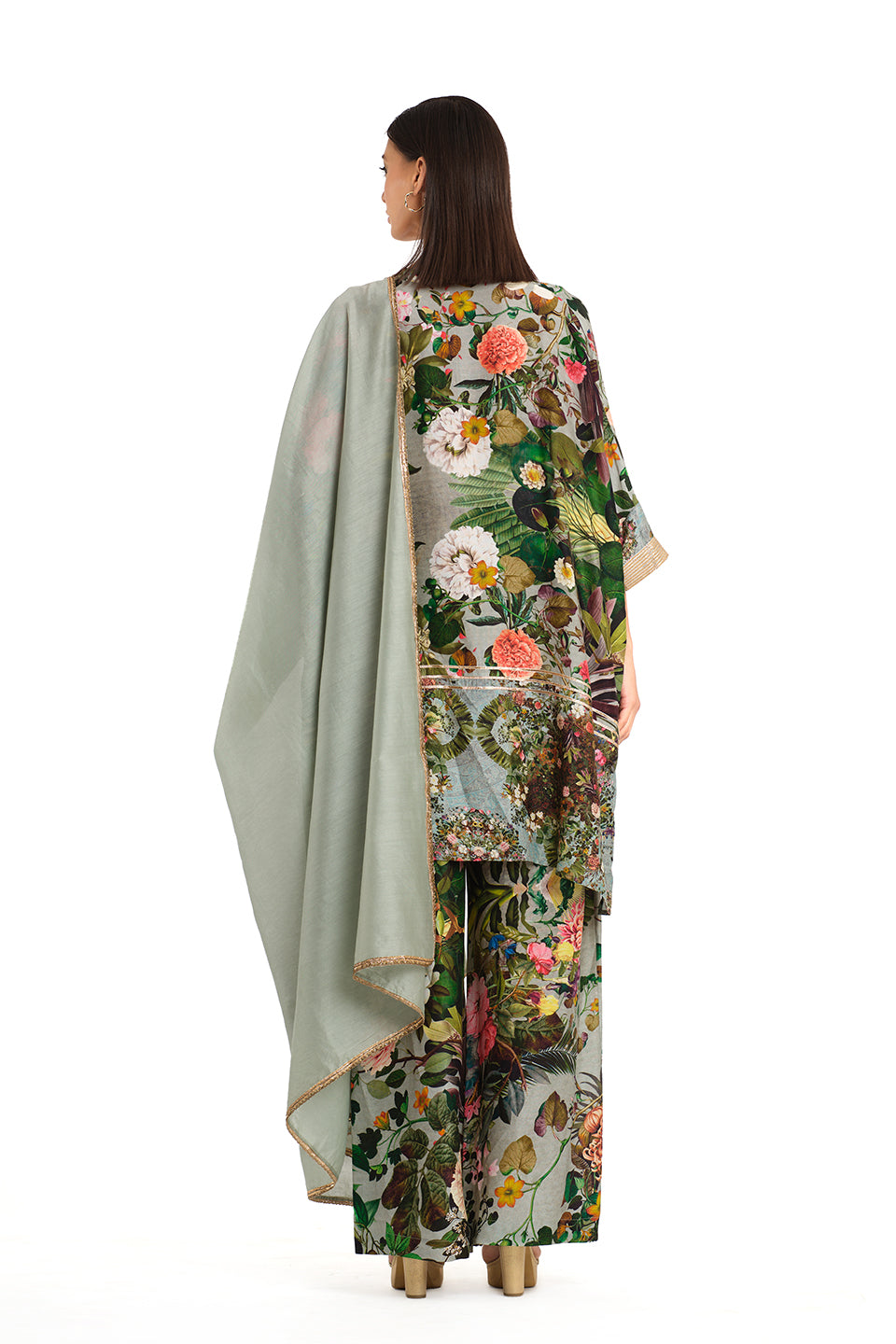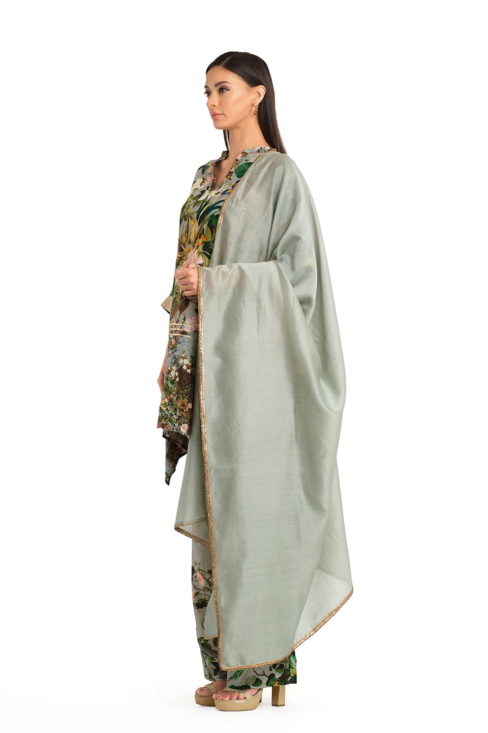 Made from raw silk botanical print, the Rocky Star Tunic set includes a printed tunic and pants with a solid chanderi dupatta. This set features beautiful gota detailing and is perfect for anyone looking for the ultimate in comfort, luxury, and fashion. This new set is sure to be a great addition to any wardrobe. For a festive look, combine the tunic set with our clutches in monochromatic colors or patterns