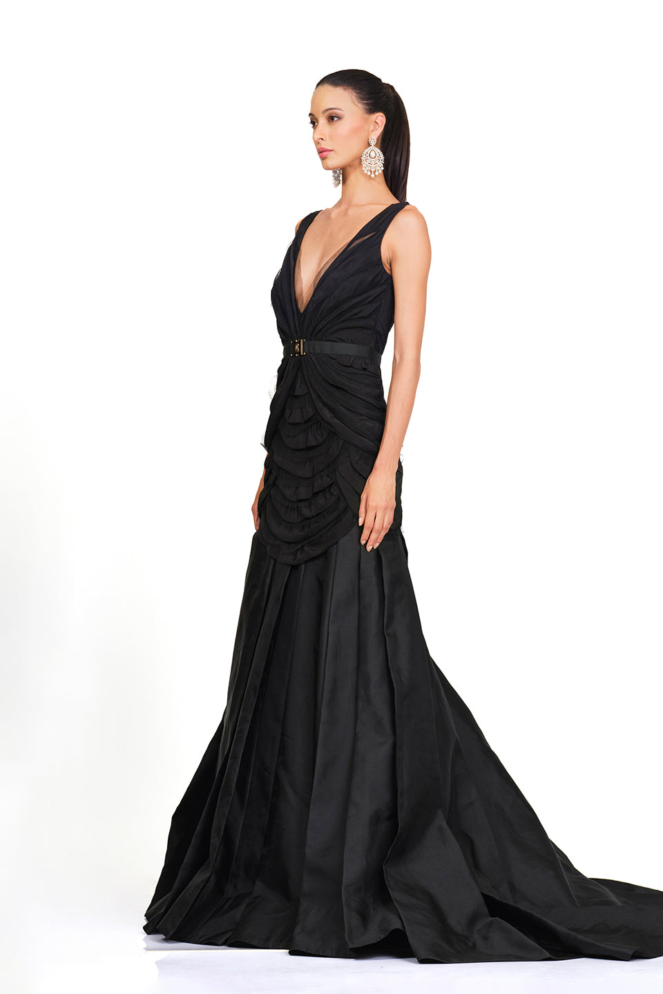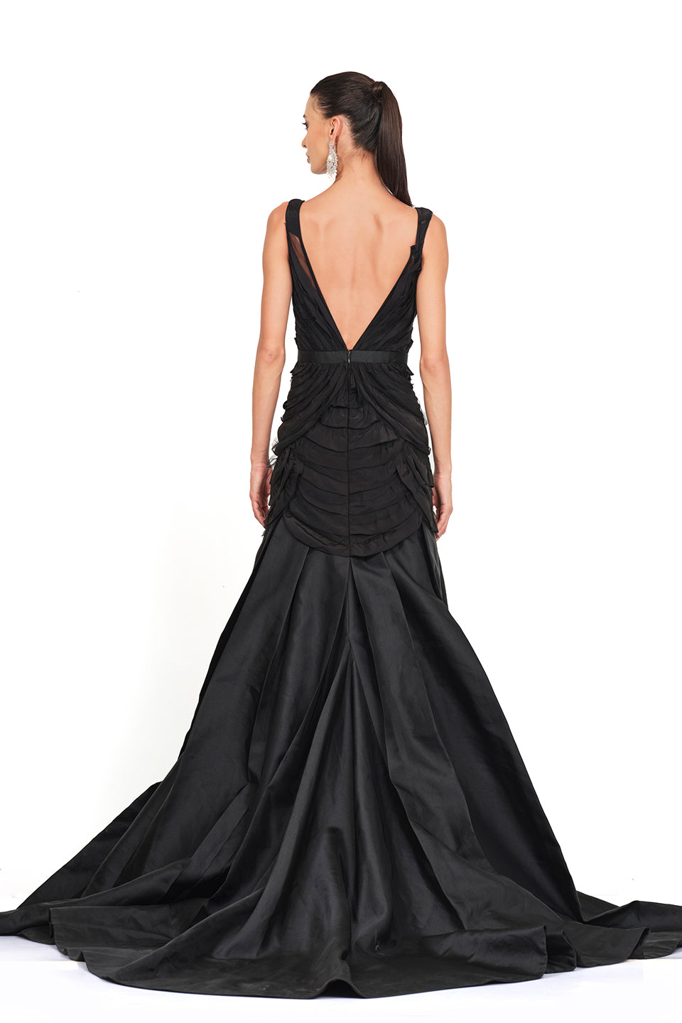 This gown features a plunging neckline that dips low in the front and back. The bodice is adorned with layered frill detailing that adds dimension and texture.
