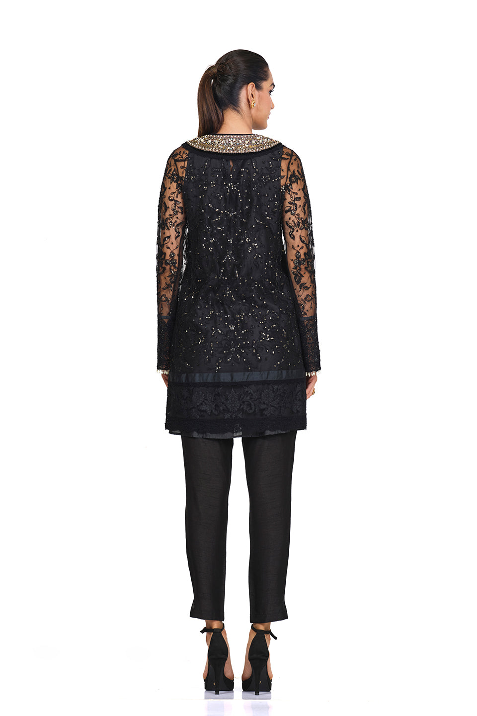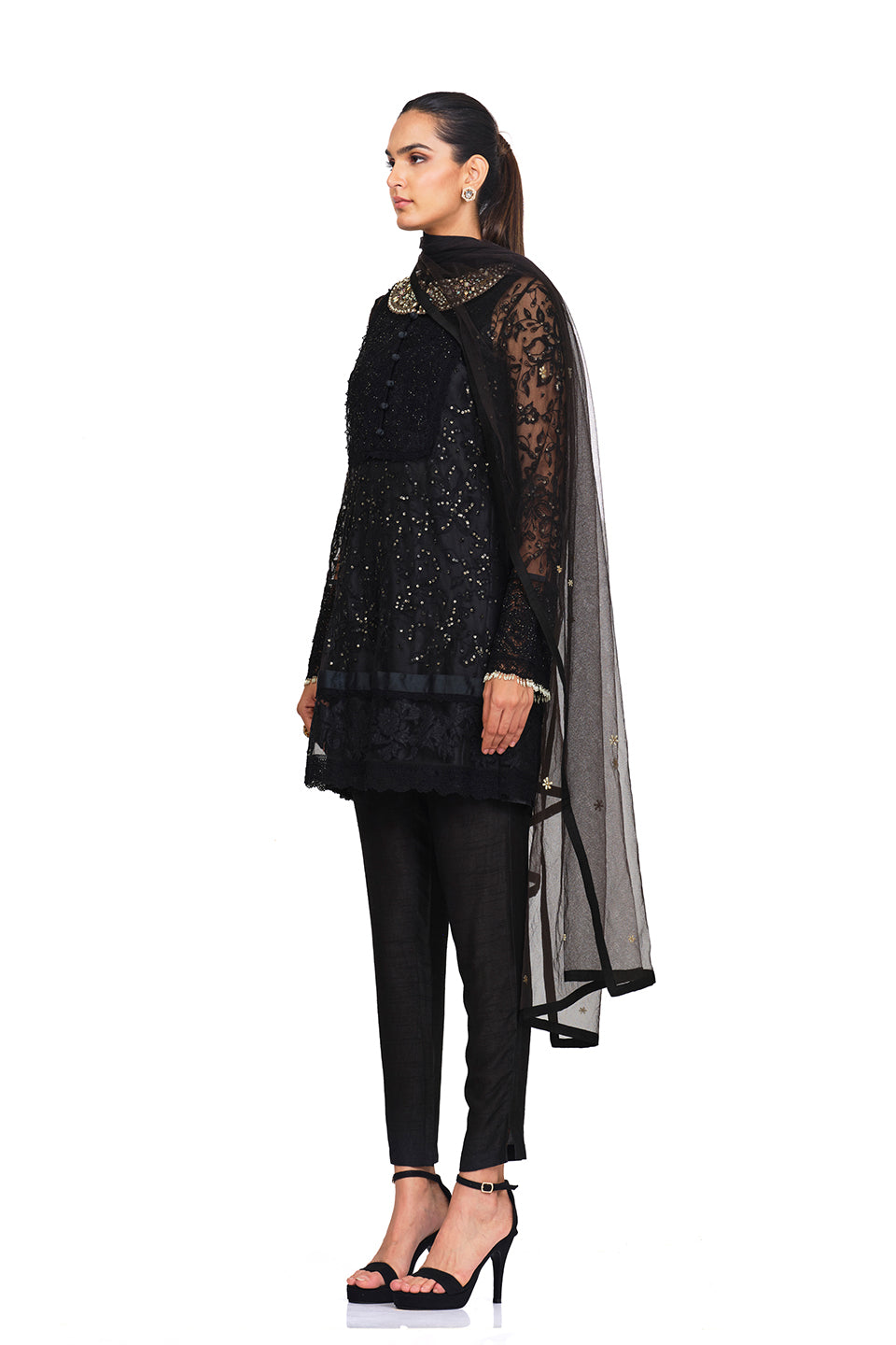 The tunic set has a jeweled neckline. It is hand embroidered, has lace detailing, and pearl embroidery on the sleeves. The sleeves also have frills. It includes raw silk straight pants, a matching inner, and a net dupatta.