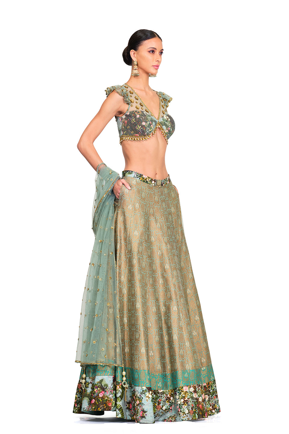 This ensemble consists of a net embroidered blouse with tassels and ruffled sleeves. It has a deep V-neck and a center back zip closure. The brocade skirt has a floral print border, and the net dupatta is embroidered with a scattering of motifs. Pair the lehenga set with Statement earrings and some dainty rings to complete the look.