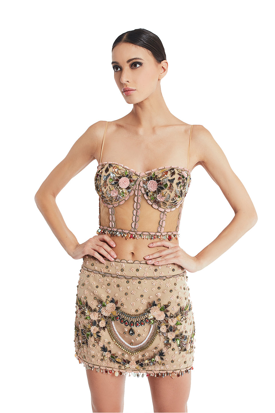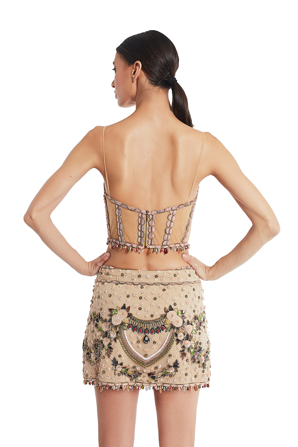 This sheer, beige corset top, which has a sweetheart neckline and a center back zipper closure, is highlighted by multicolor embroidery heavily concentrated on the cups and the top hem. The corset is designed to be worn with one of our matching skirts.
