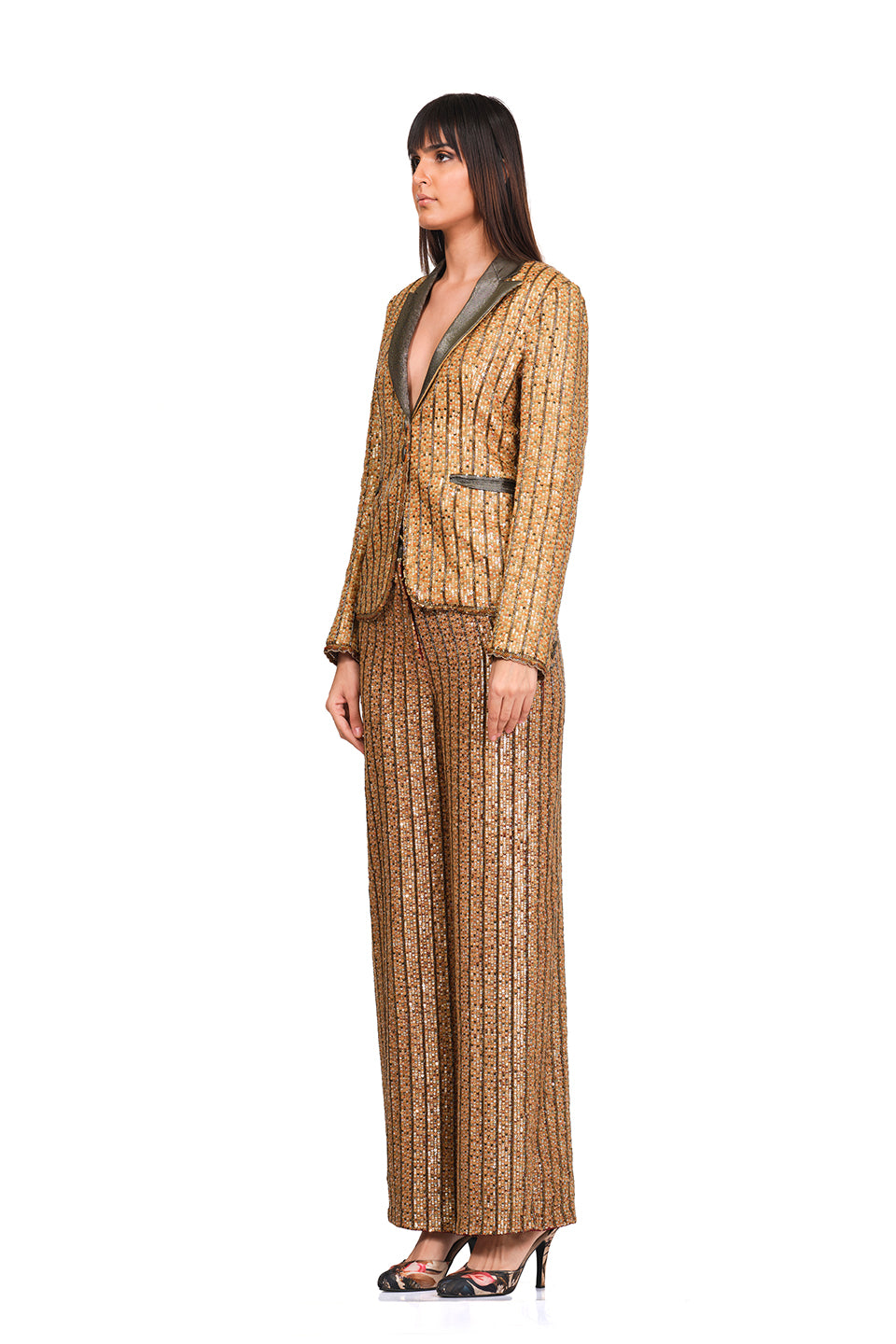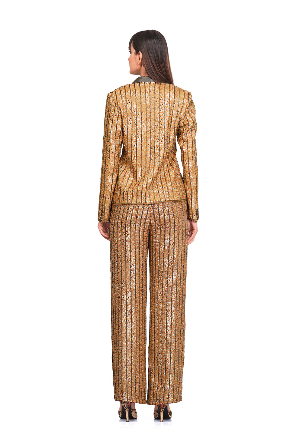 This co-ord set features a delicately hand-crafted sequin blazer and trousers. The blazer features gold lapel and pocket details and gold shimmer button closure. The trouser has pockets and a gold button closure on the waistband. For a complete look, accessorize with minimalist chain and rings.