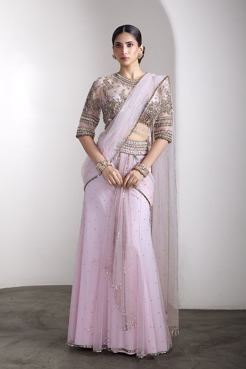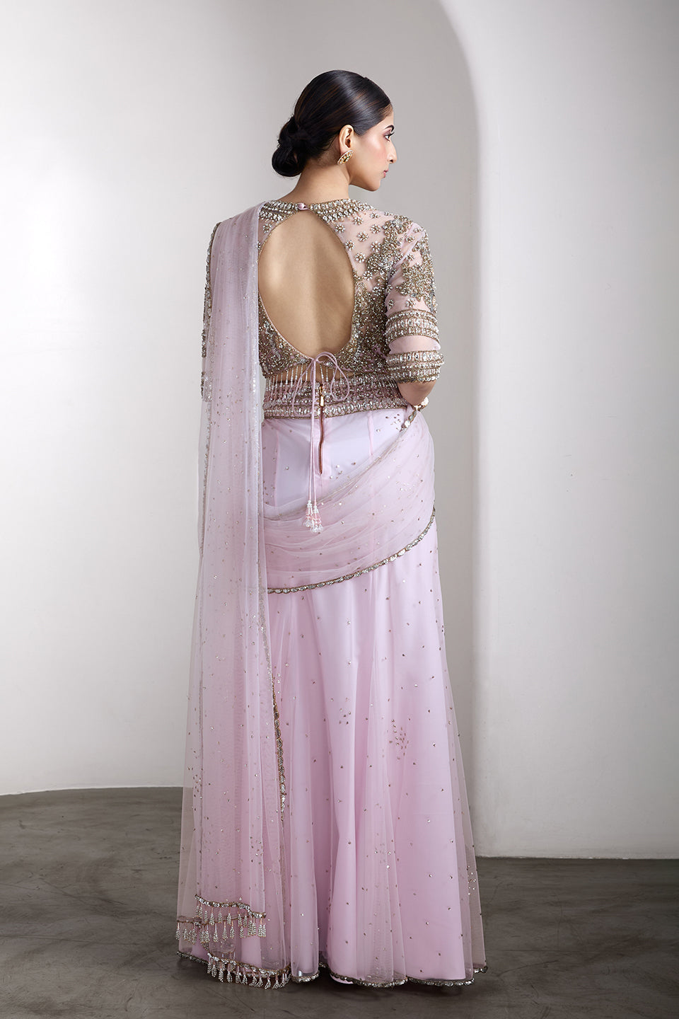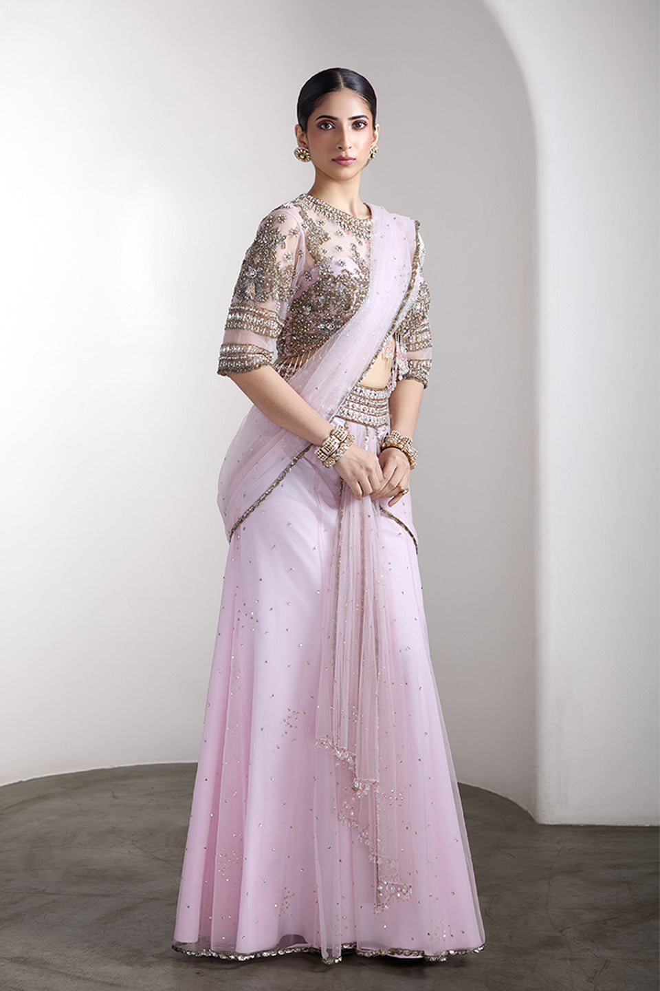 This elegant Pink drape saree set features a heavily embellished blouse with intricate beadwork and sleeves, paired with a flowing skirt adorned with an attached drape. The sheer dupatta is gracefully draped over the shoulder, adding a soft, feminine touch. Perfect for weddings or festive occasions.