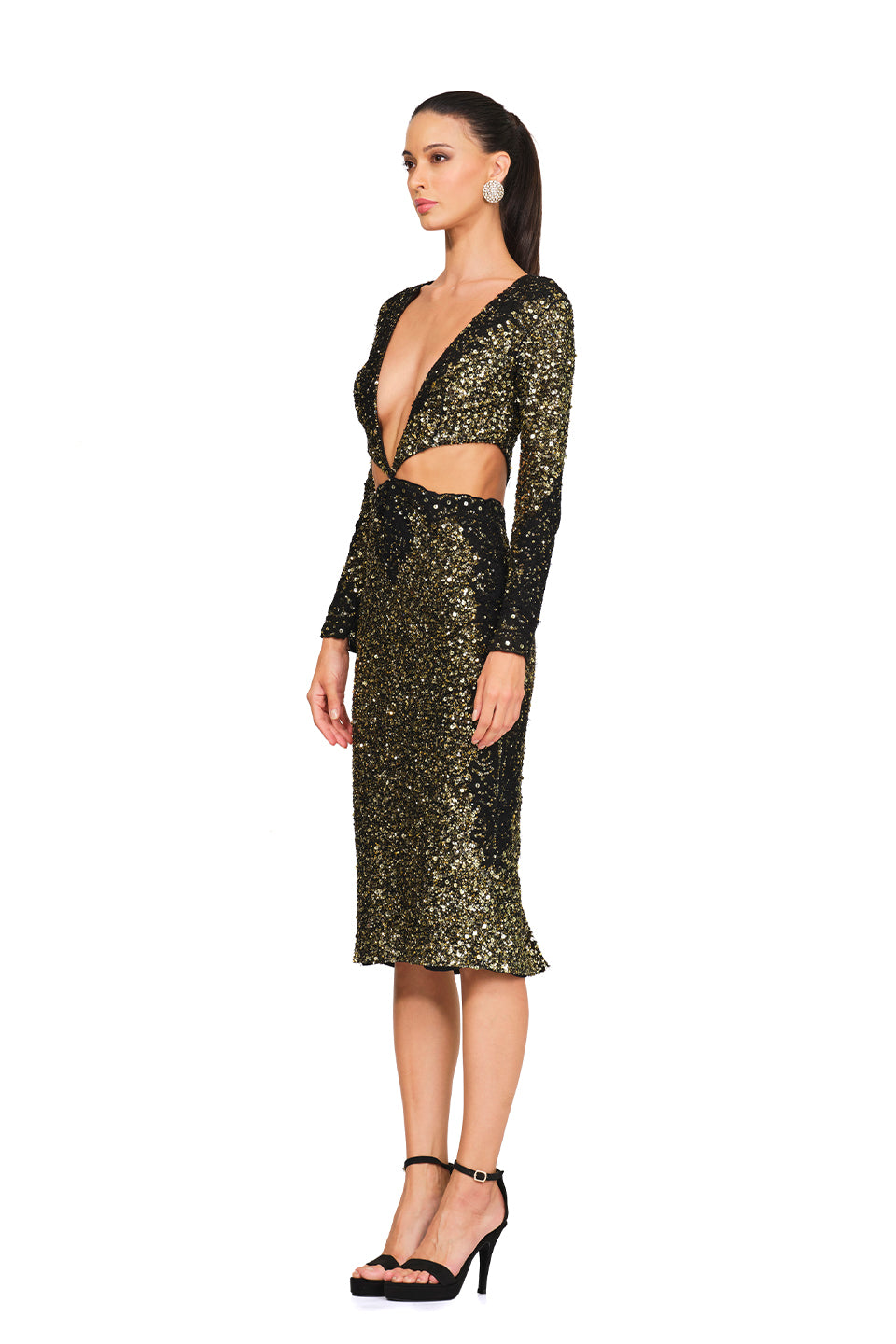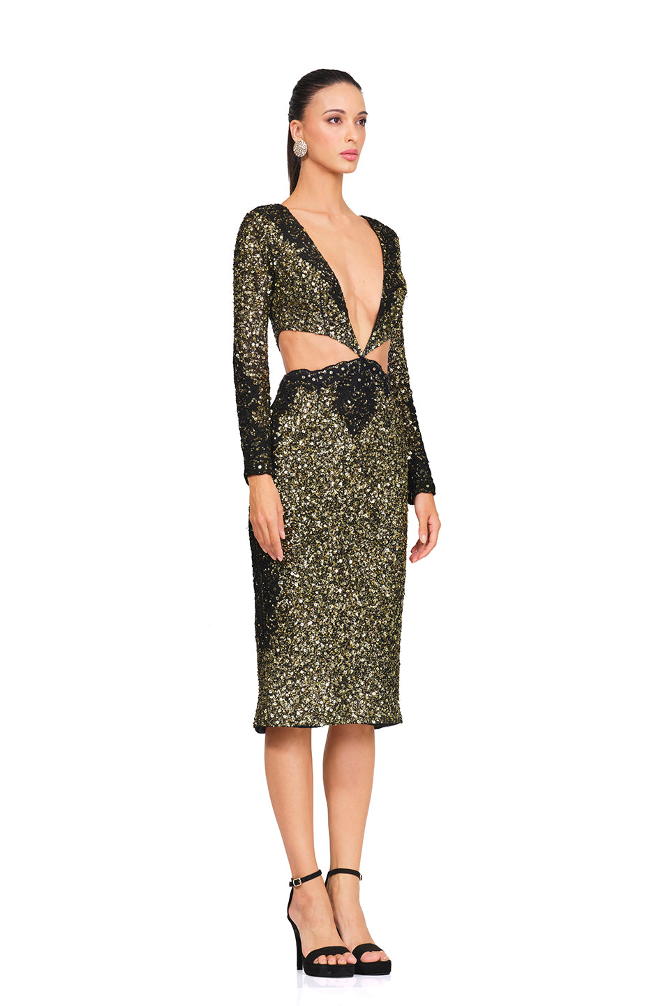 This gold sequined dress is detailed with hand-embroidered cord work. The plunging neckline features a waist cutout, and it's knee-length with a center-back zip closure. Pair this dress with a delicate gold pendant necklace and sleek stilettos for a refined and graceful evening look.