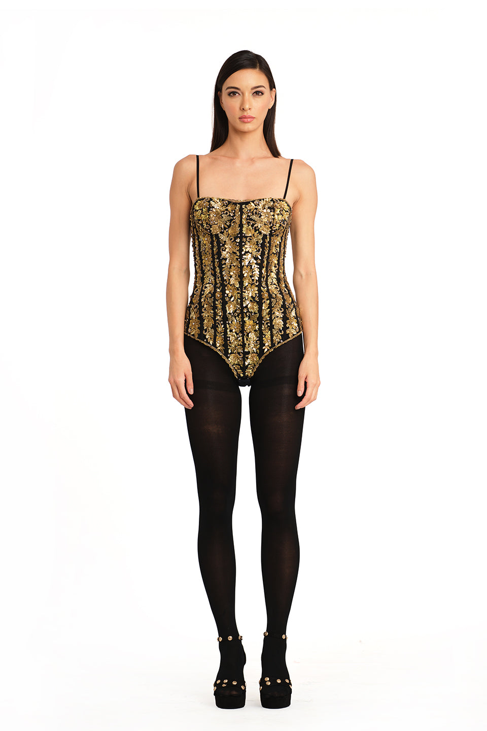 Corset bodysuits have got to be our favorite way to amp up any look. This one, with its floral embroidery, is especially stylish, and just can't get enough of the scalloped edging.