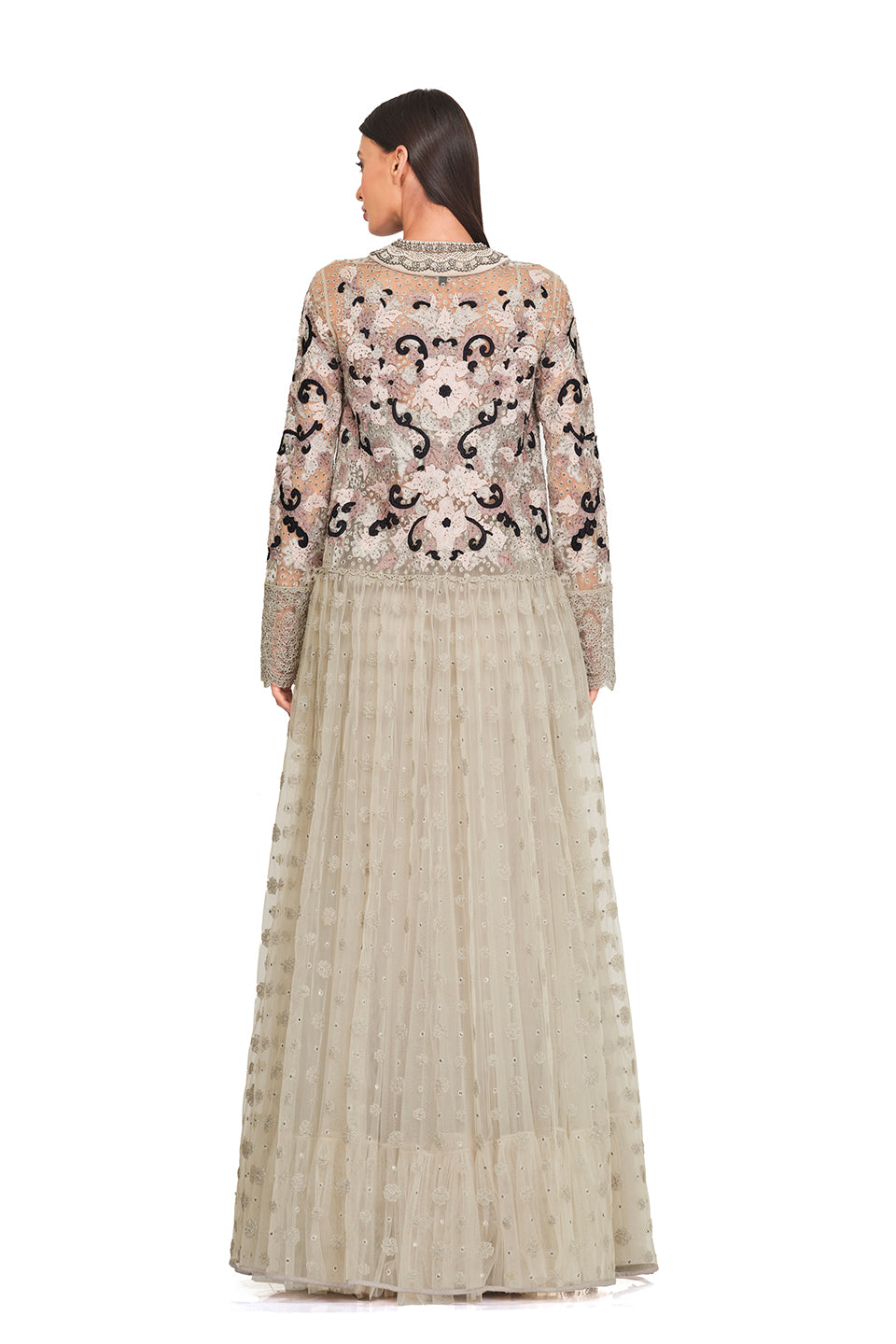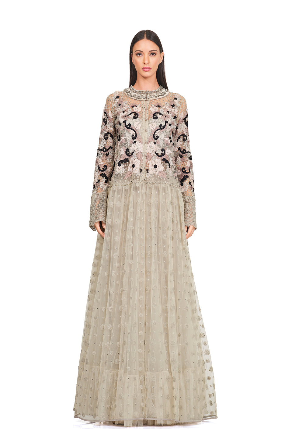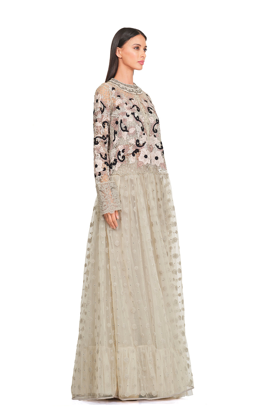 This gown features a long tunic, an embroidered bodice, patchwork embroidery, an embellished neckline, ruffles, and a flare. It is also embellished with pearls and floral patches all over the gown. Keep it minimal yet chic with delicate gold jewelry, nude heels, and a structured handbag.