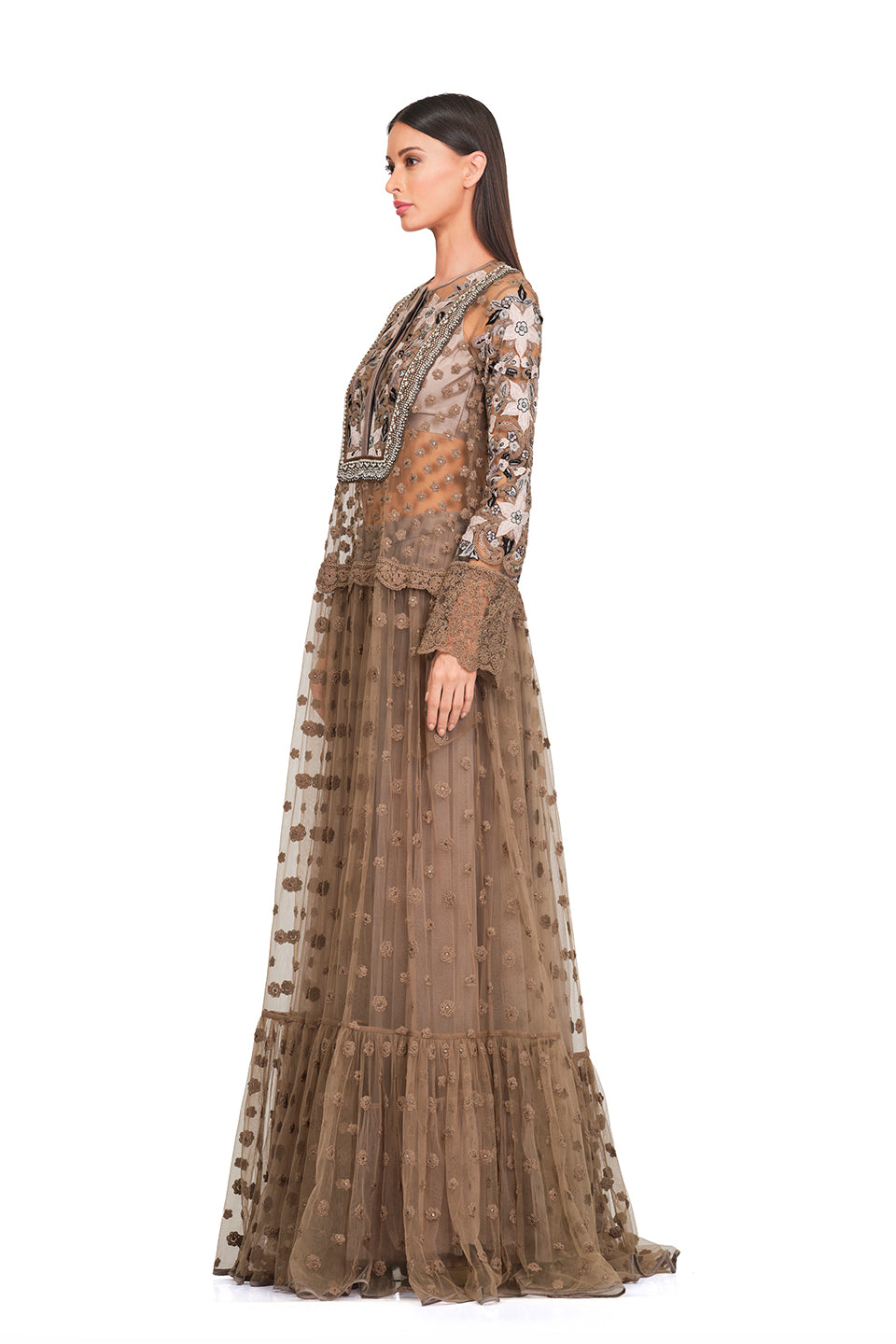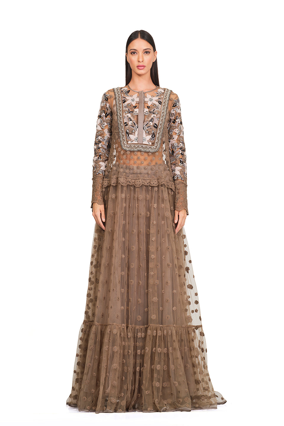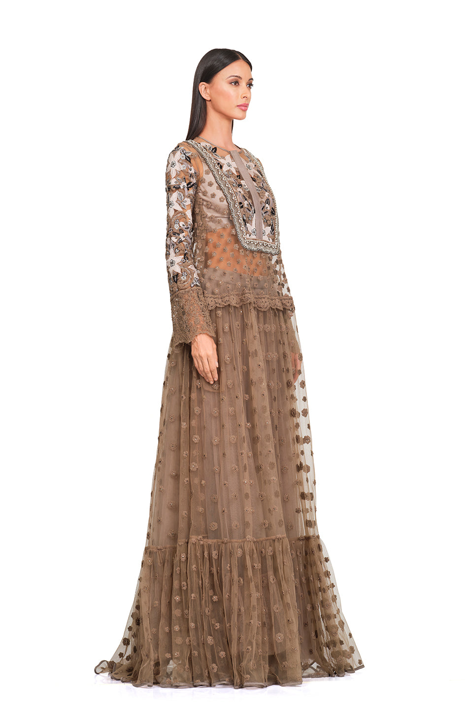 This gown features a long tunic, an embroidered bodice, patchwork embroidery, an embellished neckline, ruffles, and a flare. It is also embellished with pearls and floral patches all over the gown. Keep it minimal yet chic with delicate gold jewelry, nude heels, and a structured handbag.