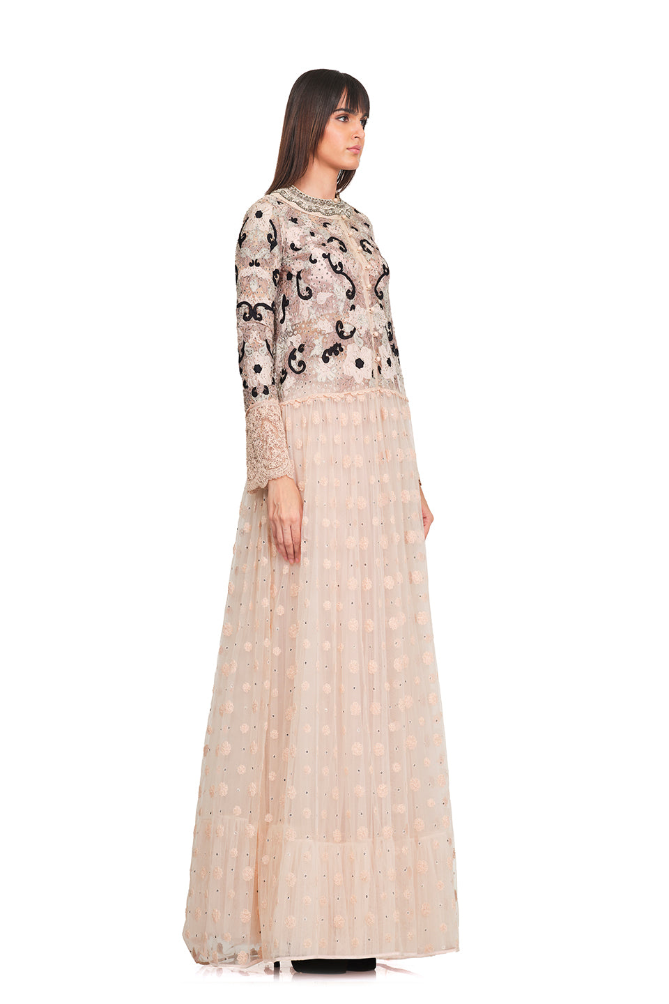 This gown features a long tunic, an embroidered bodice, patchwork embroidery, an embellished neckline, ruffles, and a flare. It is also embellished with pearls and floral patches all over the gown. Keep it minimal yet chic with delicate gold jewelry, nude heels, and a structured handbag.