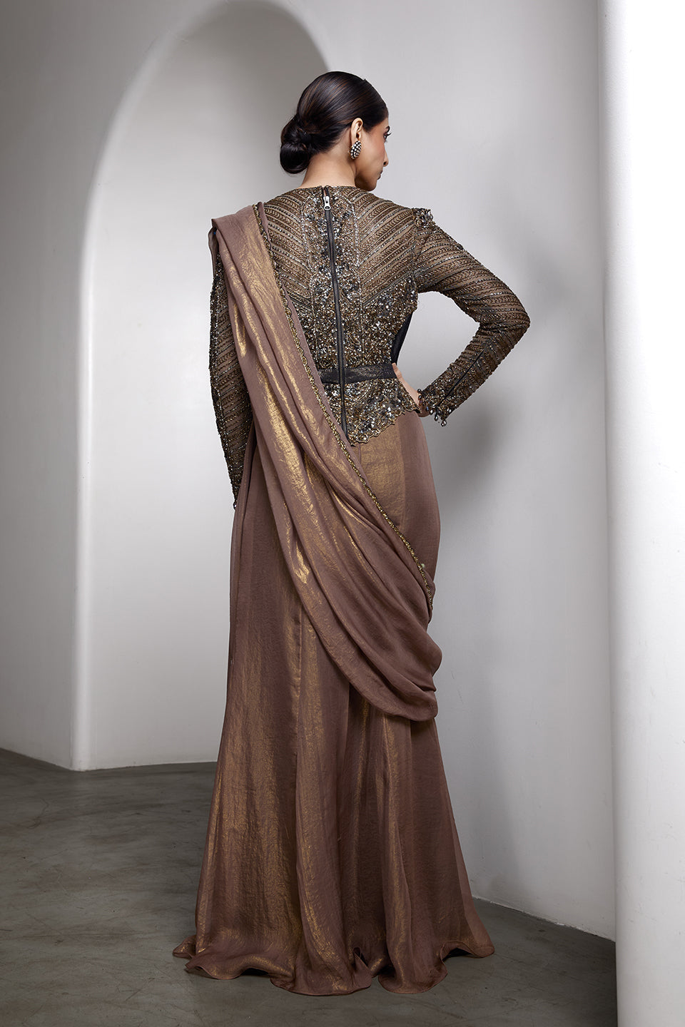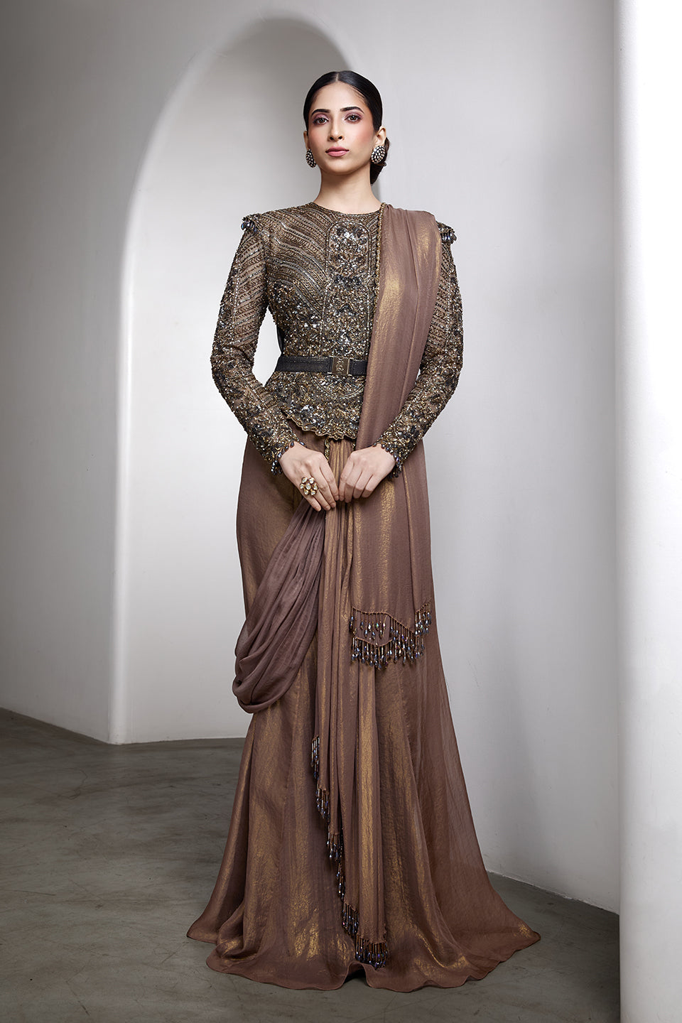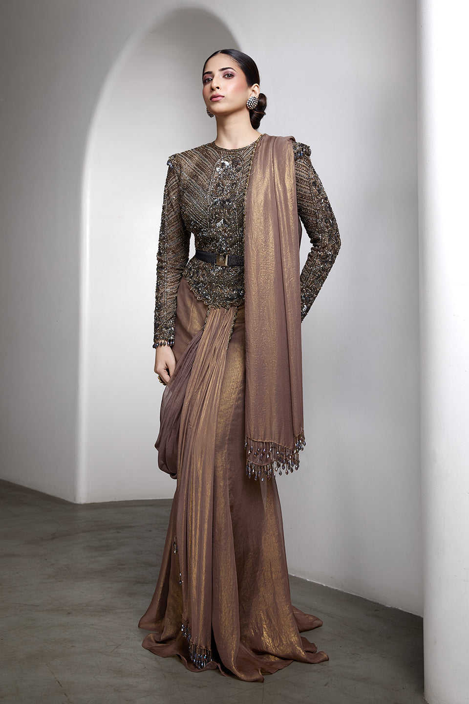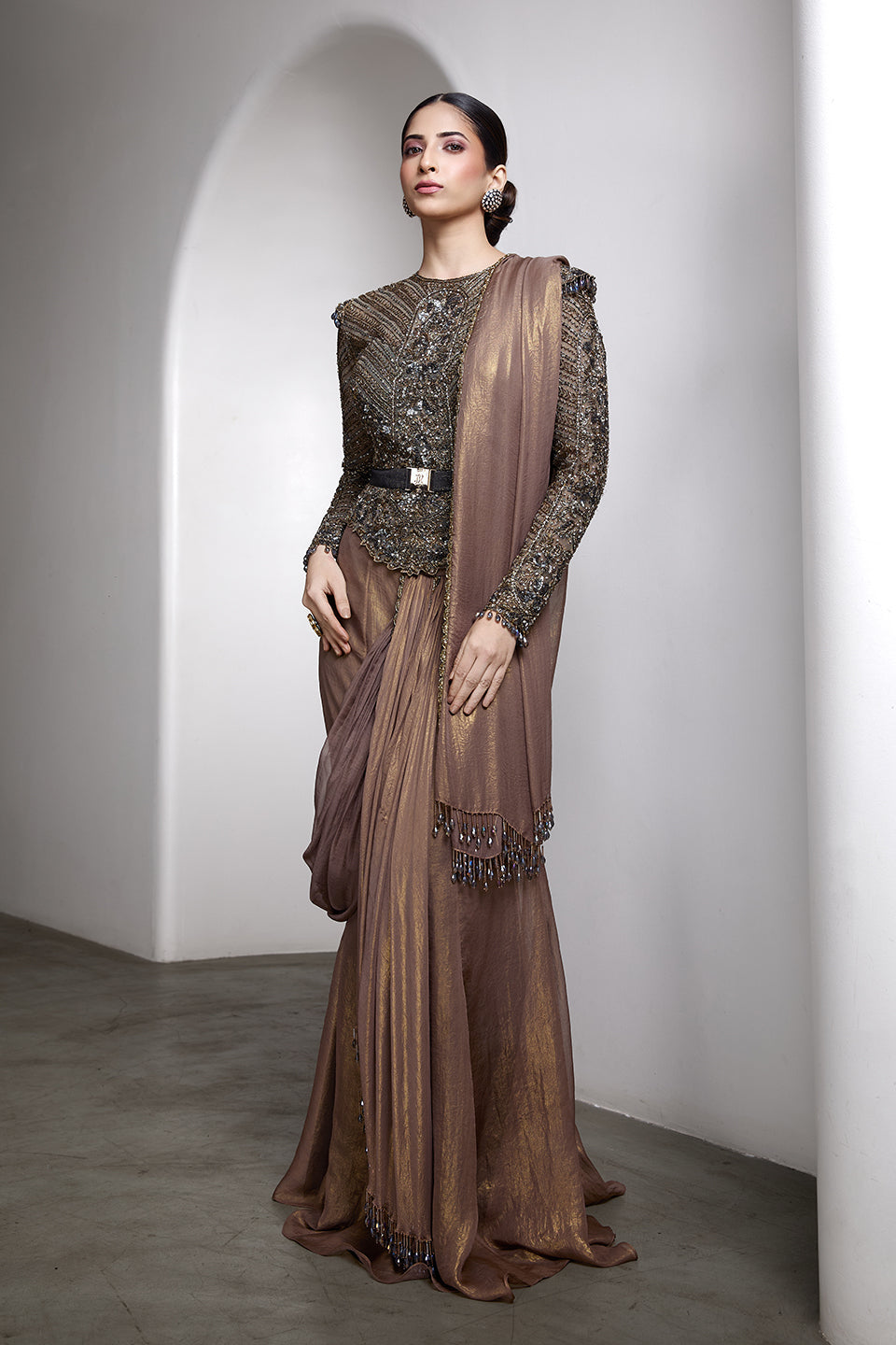 This elegant drapped saree set features a heavily embellished, full-sleeve blouse with intricate embroidery paired with a draped metallic nude skirt. The structured bodice detail add a modern twist to traditional styling. Perfect for receptions or evening events.