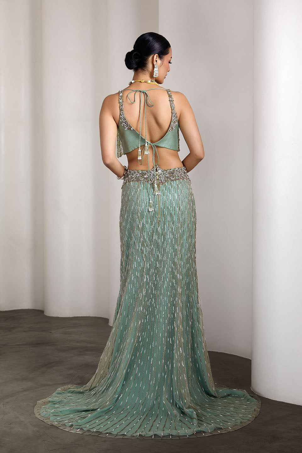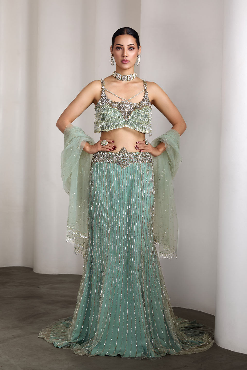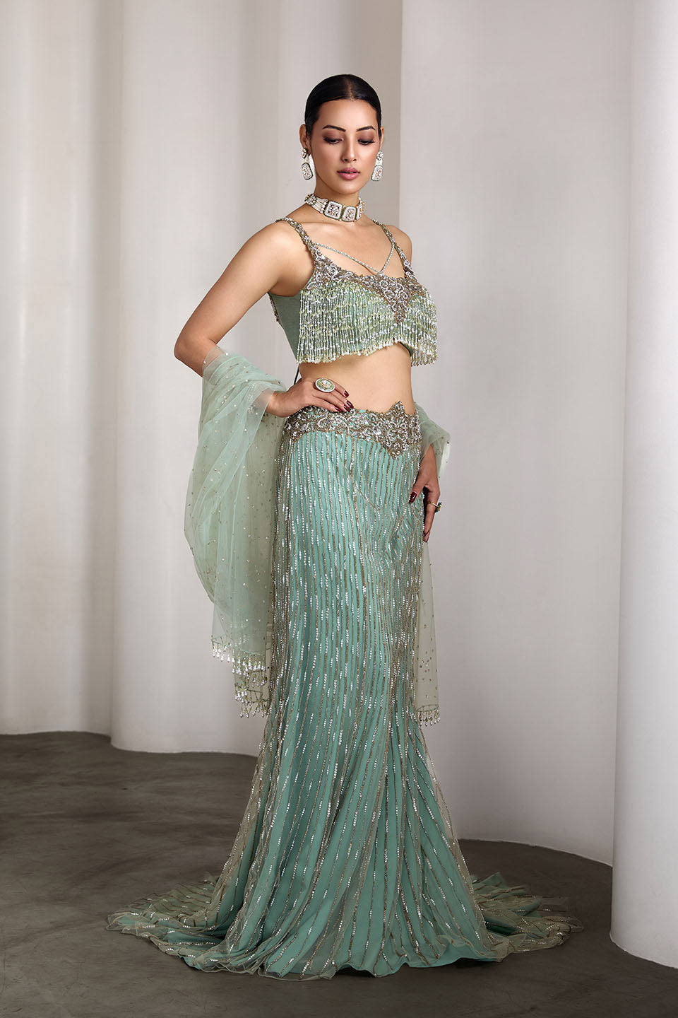 This Aqua lehenga set features a delicately embellished blouse with sequin work and a sheer dupatta draped gracefully over one shoulder. The flowing skirt is adorned with intricate detailing, creating a dreamy, ethereal look. Perfect for weddings, sangeets, or festive celebrations.