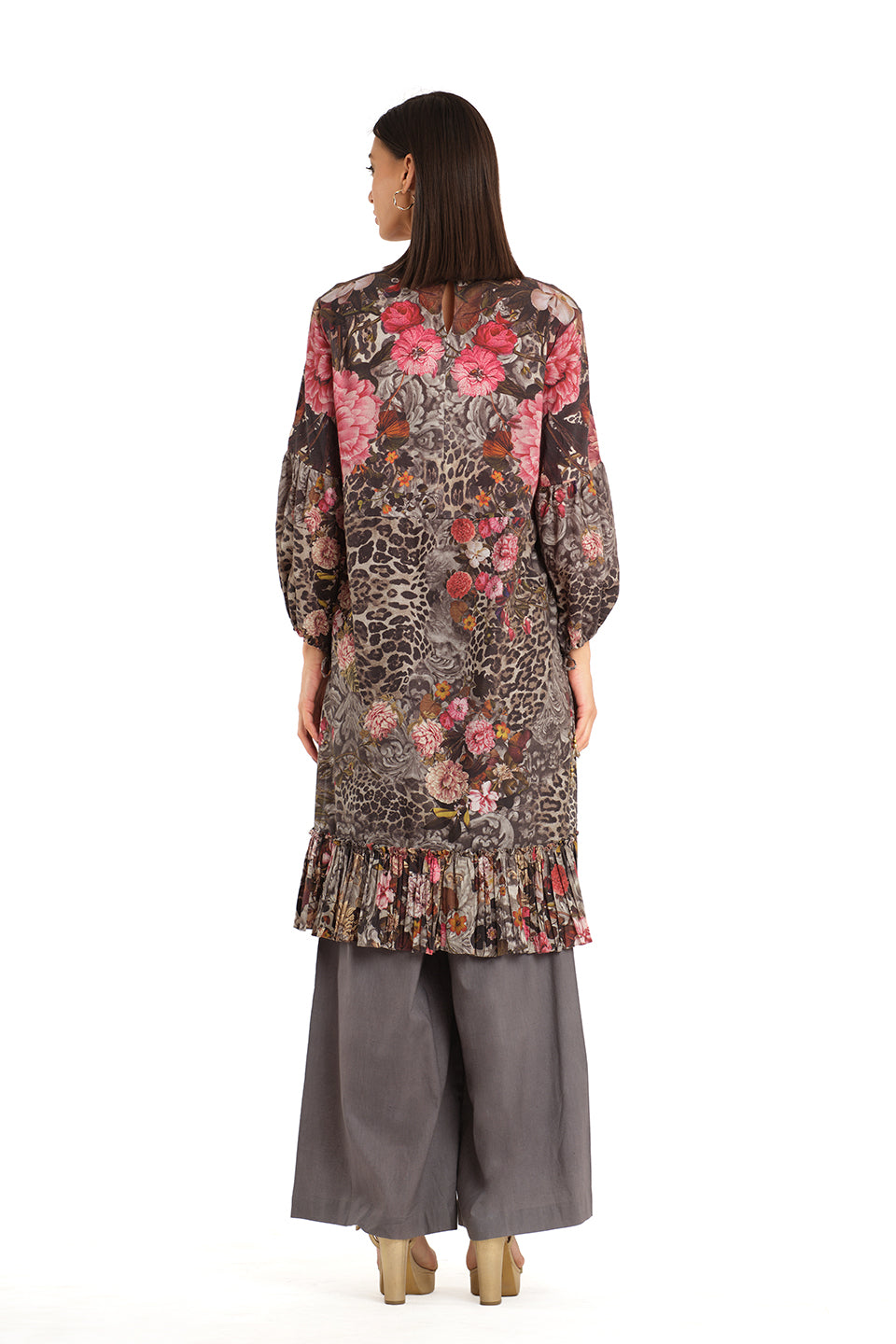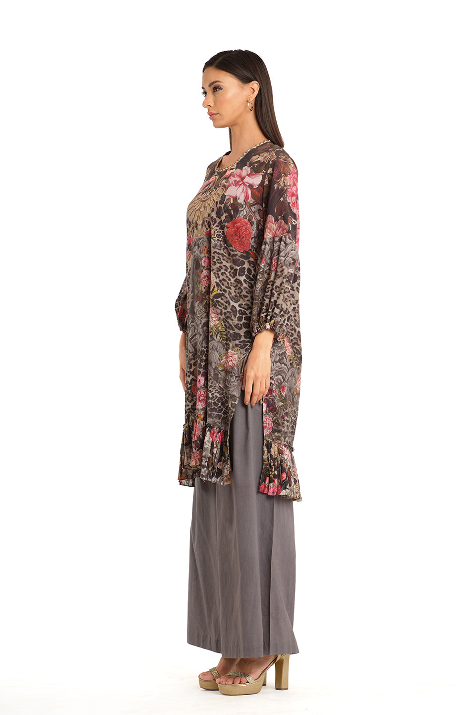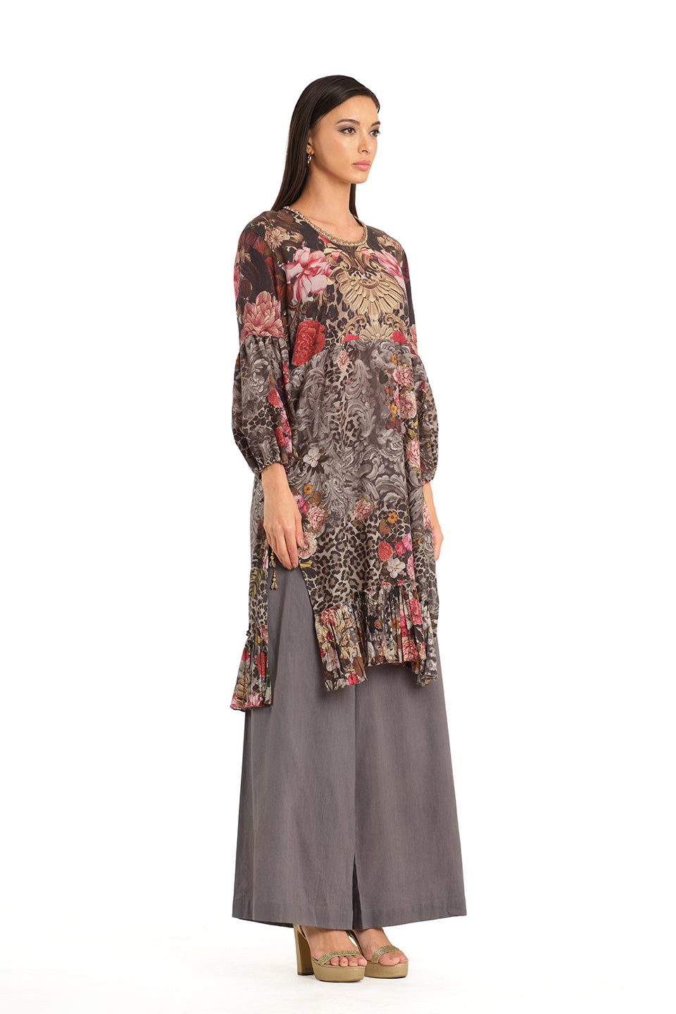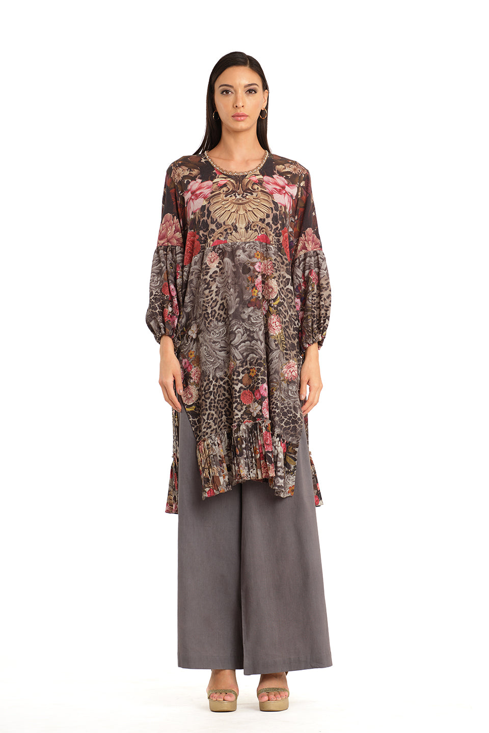 This tunic set features a printed tunic with embroidery detail on the neck yoke with embroidery. It also features solid pants, scallop detailing on both the neck and the sleeve hem, and a baroque signature print. Go for a bold, colorful clutch to add a pop of vibrancy to a neutral-toned tunic.