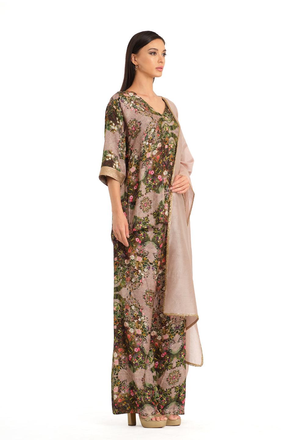 This garment set is sure to turn heads. It's crafted from the finest materials and put together expertly. It comes with a signature printed tunic with Gota work detailing, a pair of printed silk pants, and a solid Chanderi dupatta. Wear a bold ring or a stack of bangles to elevate the outfit.