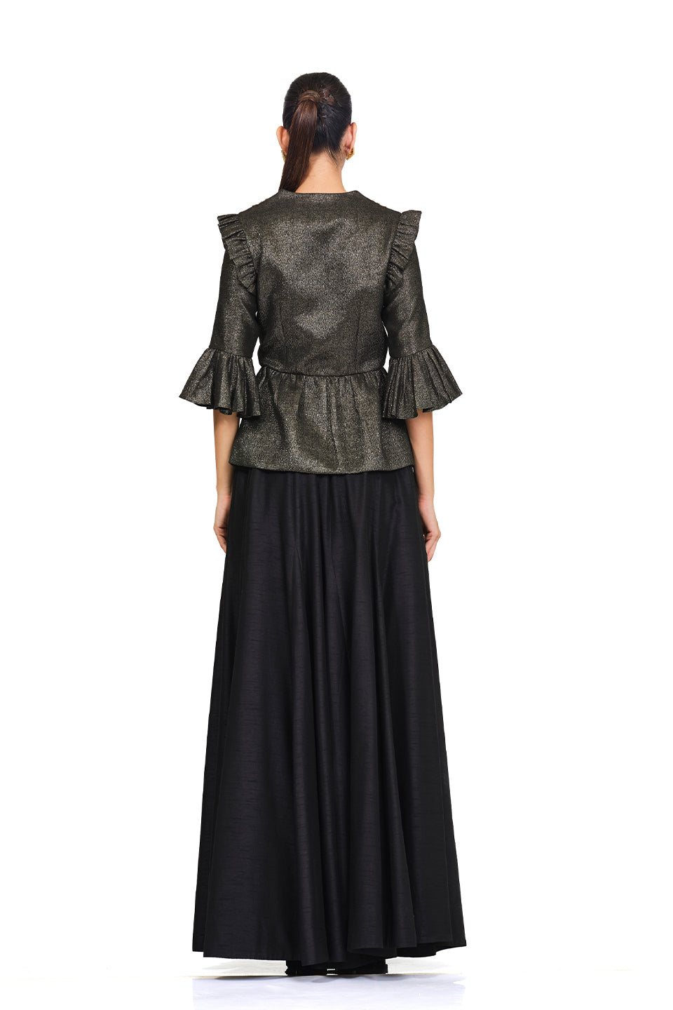 The outfit has a tulle black skirt paired with embroidered peplum top which is cinched at the waist. Pair this ensemble with studded earrings and a clutch to complete the whole look.