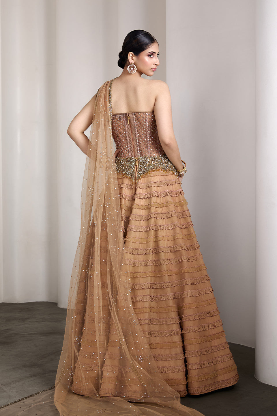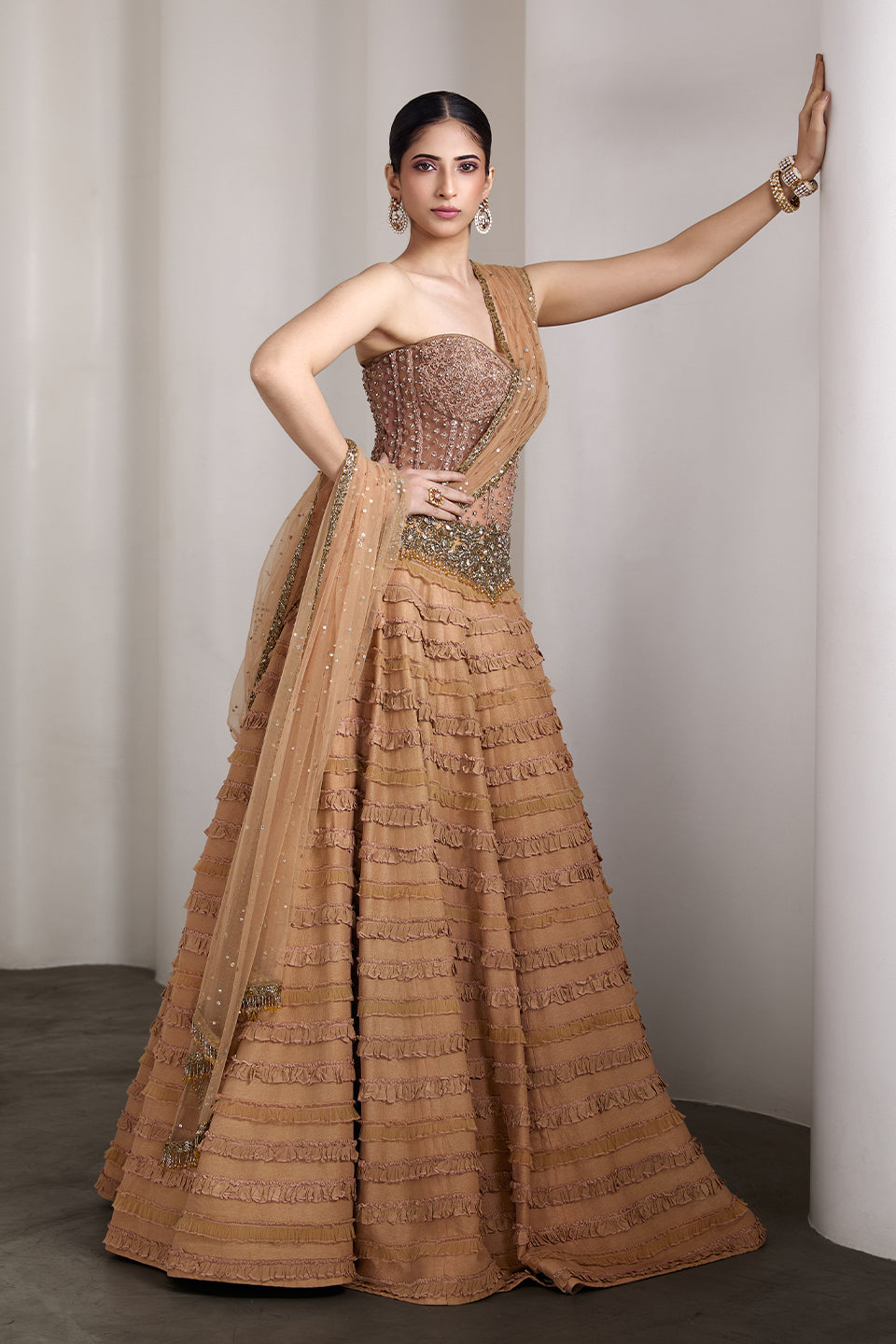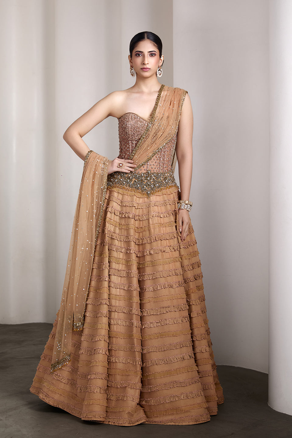 Lehenga set features a strapless, embellished bodice with intricate beadwork and a sheer, diagonally draped dupatta-style overlay, paired with a voluminous skirt adorned in horizontal textured ruffles, creating a rich, layered effect in soft beige and gold tones.