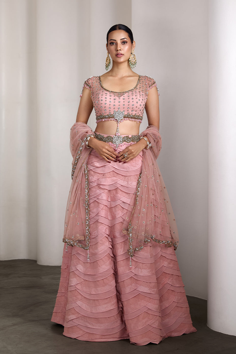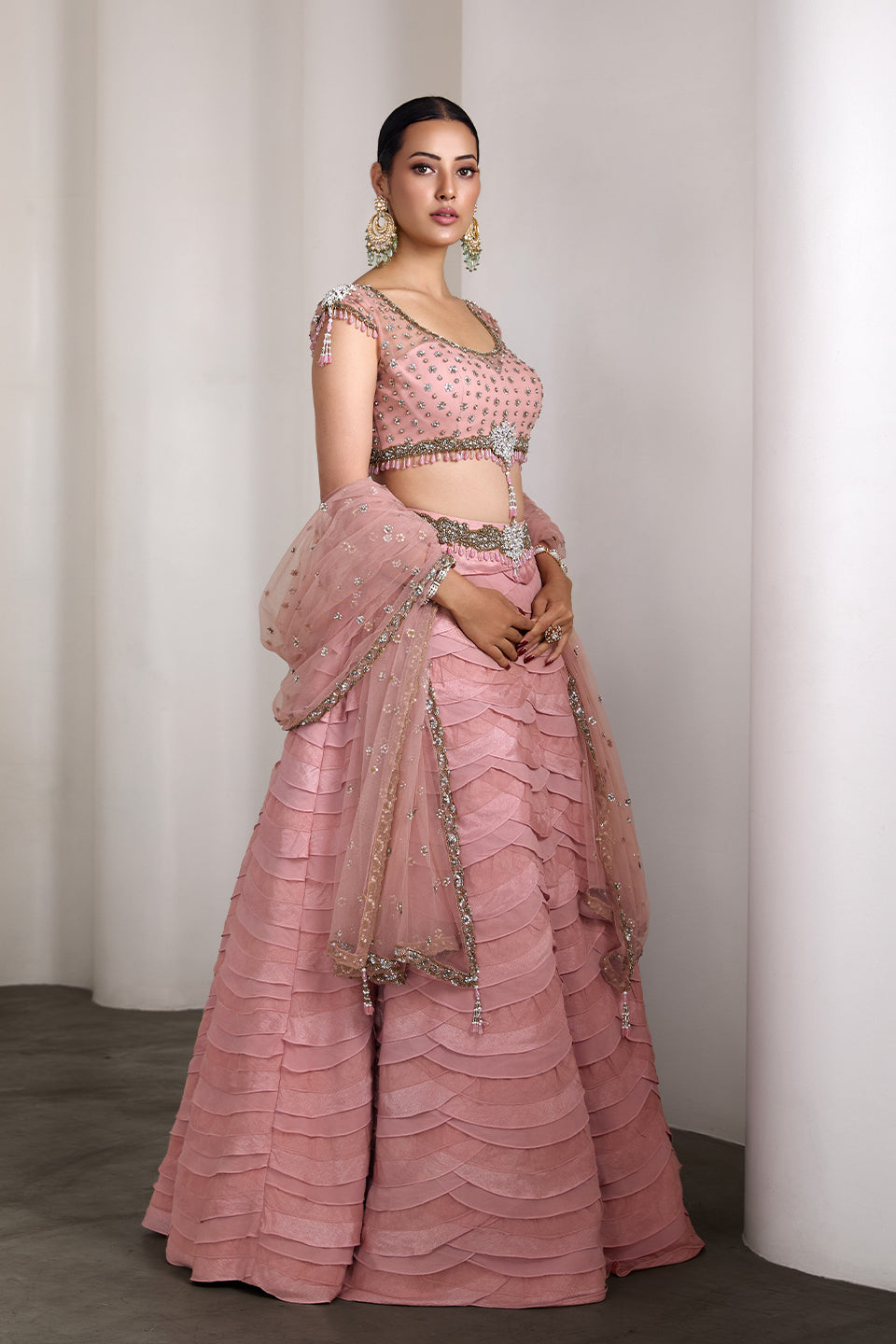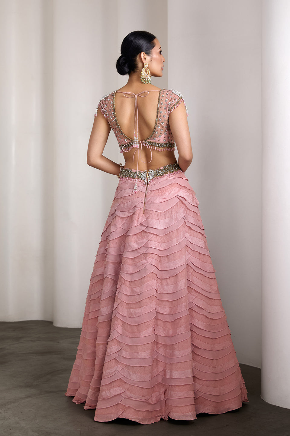 Lehenga set features a cap-sleeved blouse adorned with intricate beadwork and sparkling embellishments, paired with a voluminous skirt adorned in horizontal textured ruffles, creating a rich, layered effect.