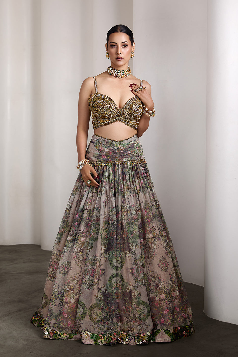 This outfit features a gold embellished blouse with intricate chain work, paired with a flowy floral-printed lehenga skirt, blending glam and inspired elegance.