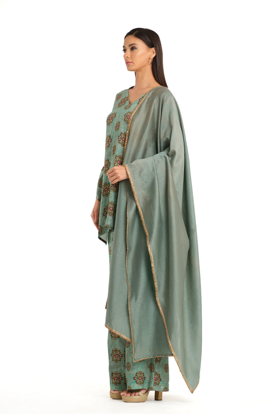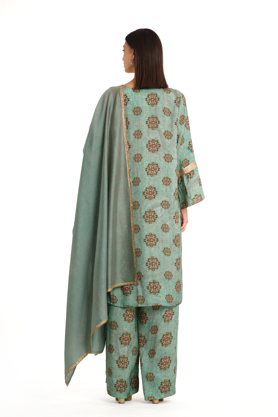The design of the Tunic set is inspired by the Signature print. The Tunic is printed with the print, and the dupatta is solid colored Chanderi. The pants are printed Raw Silk. To finish, it has Gota Detailing, which is a type of gold work. Layer a delicate necklace with a pair of statement earrings for a more balanced accessory look