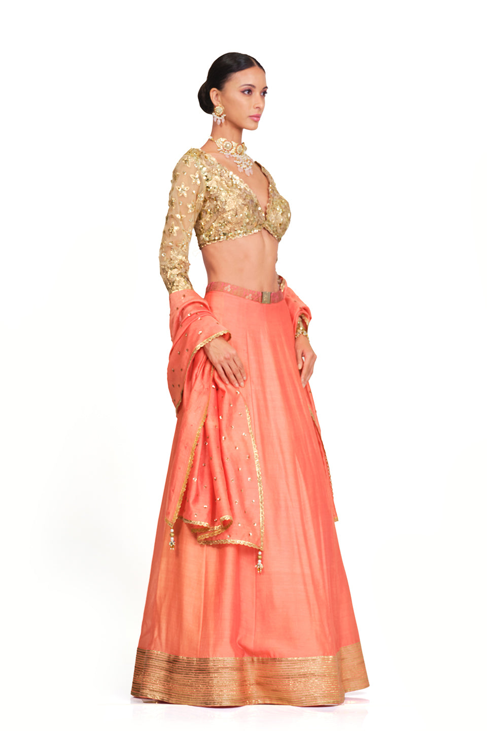 This lehenga set comprises a full-sleeved sequin gold blouse with a deep V neck, a raw silk skirt with a gota border, an embroidered dupatta with tassels, and a signature belt. Carry a metallic or embellished clutch in a matching tone to your lehenga.