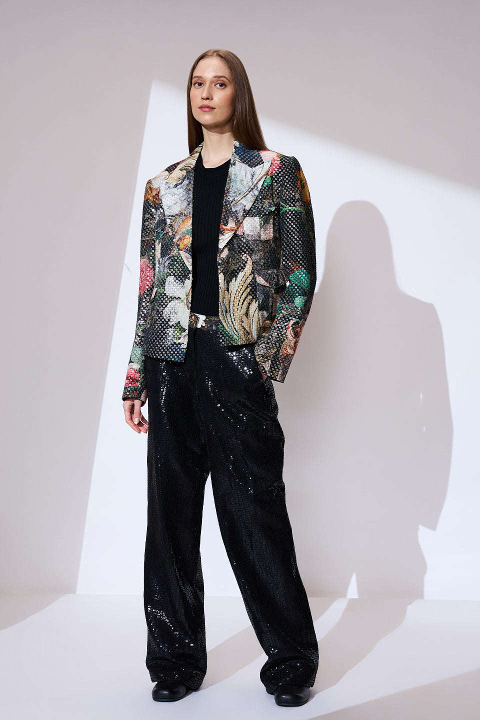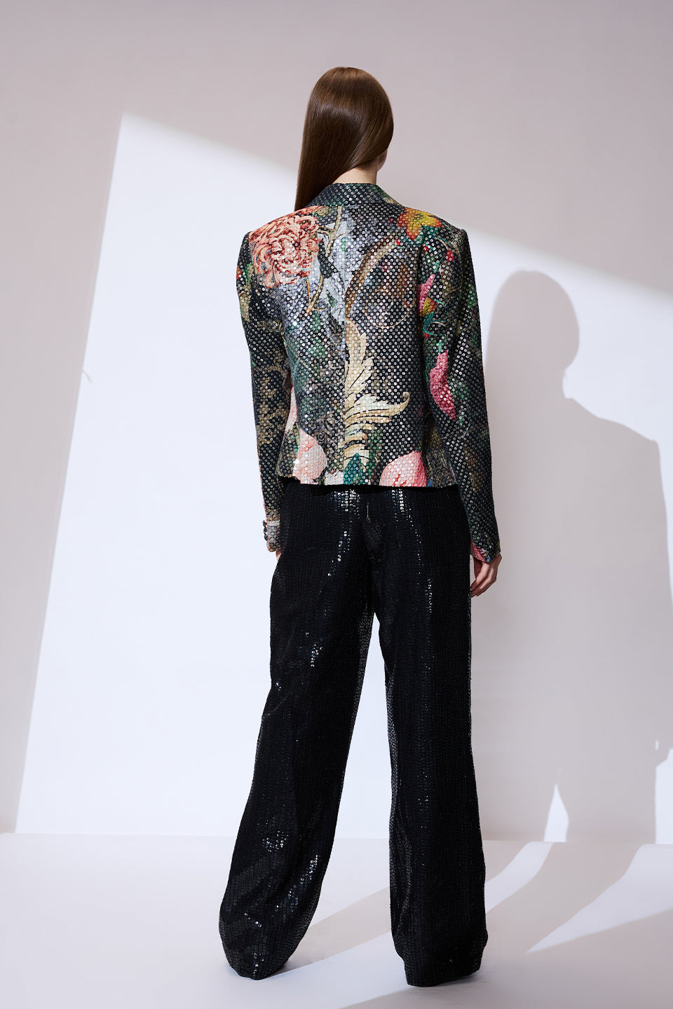 This exclusive tailored fitted blazer is created from classic raw silk. The striking allover sequins adorns this blazer, featuring a classic structured lapel, finished with signature printed allover detailing.