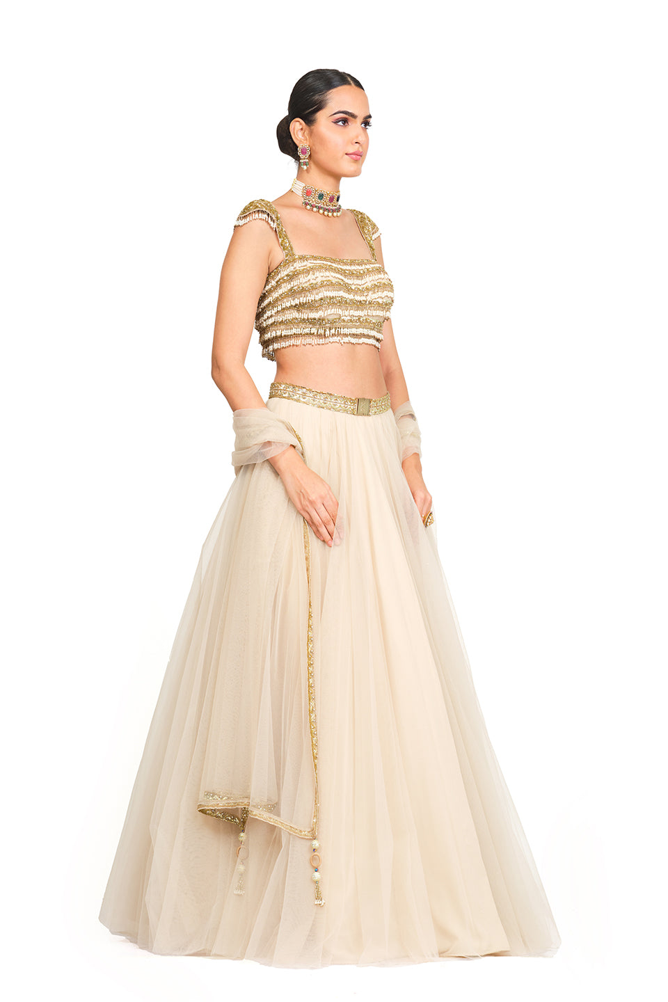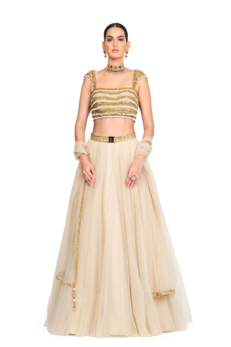 This lehenga ensemble comprises a tulle lehenga with an embroidered waistband with signature R buckle, a tulle dupatta adorned with gold border embroidery, and a deep neck blouse embellished with Bead danglings which has a centre back zip closure. Opt for statement earrings like oversized hoops or tassel earrings that complement the tassel details of the blouse, tying the whole look together.