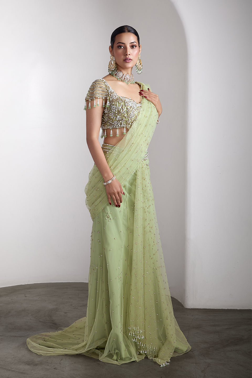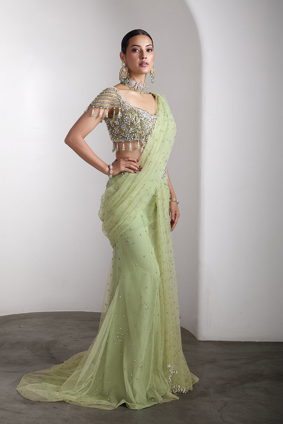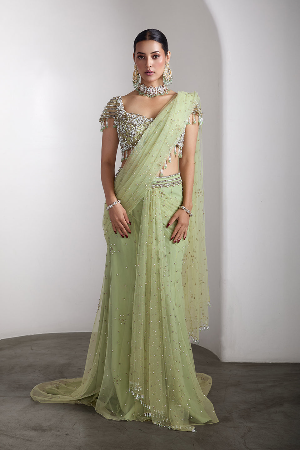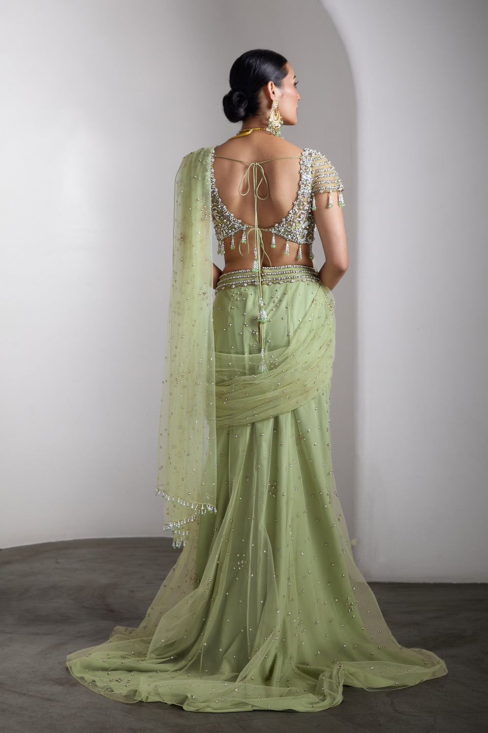 This green drapped saree set features a heavily embellished blouse with intricate beadwork and has sleeves. The matching sheer dupatta is attached and flowing skirt is adorned with delicate sequins, adding a subtle shimmer, Perfect for festive occasions.